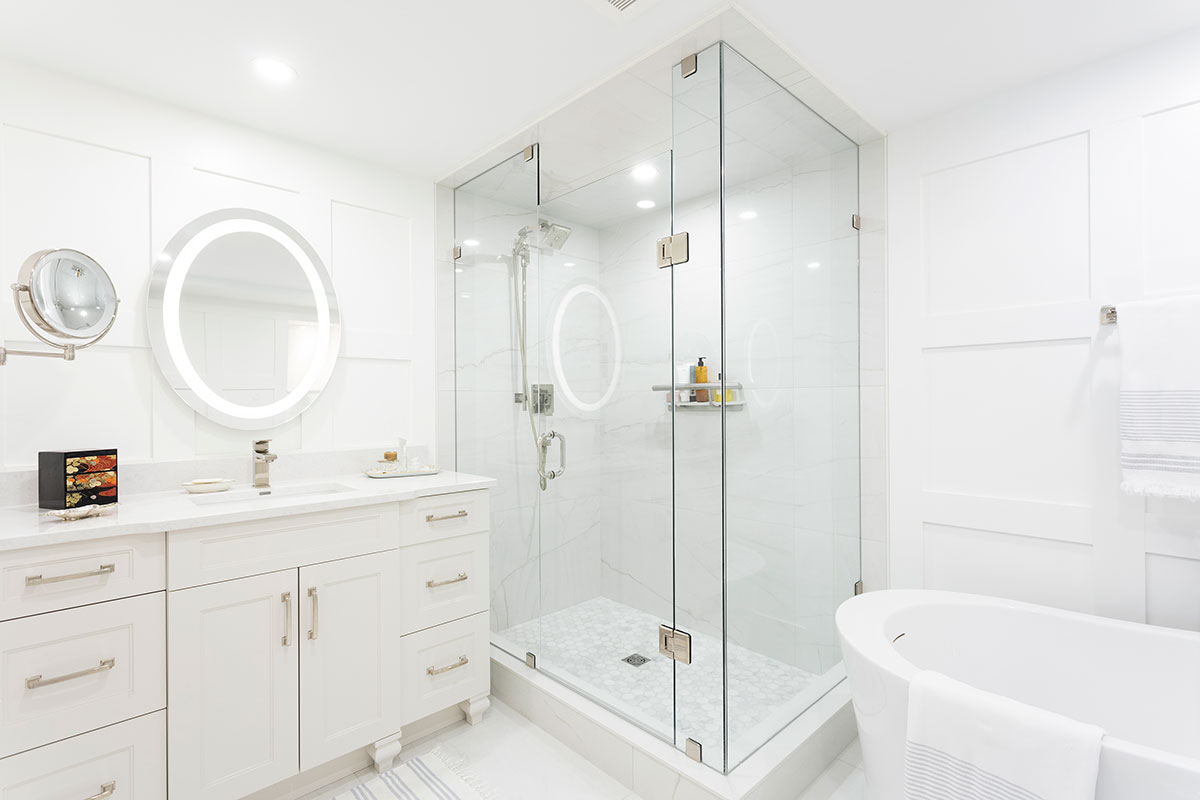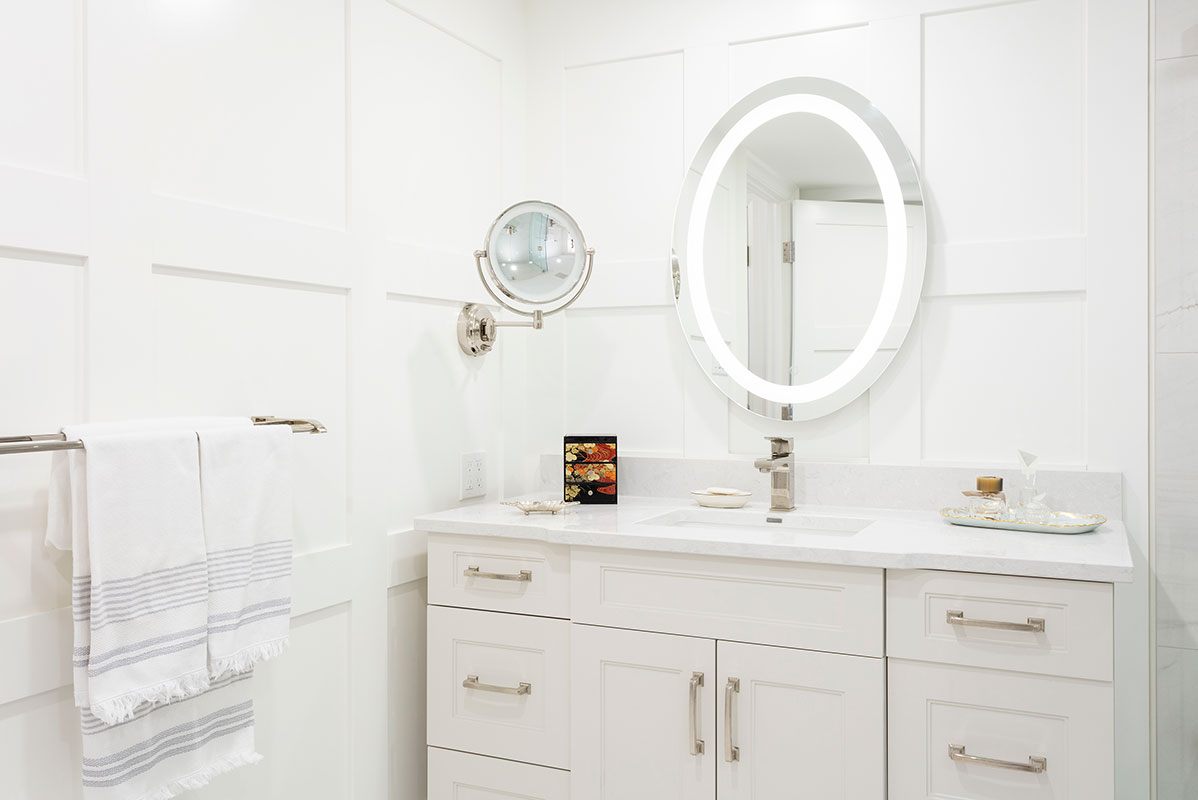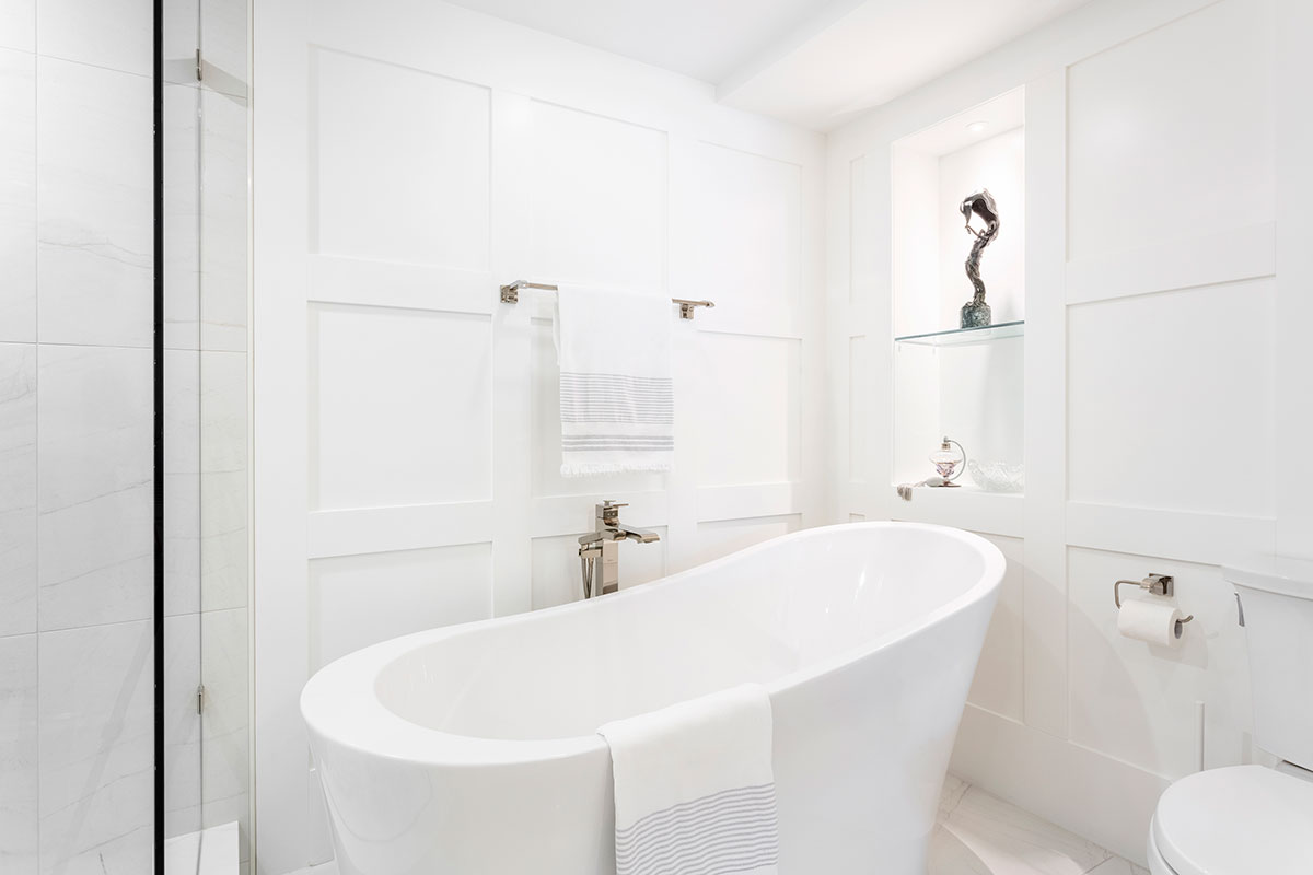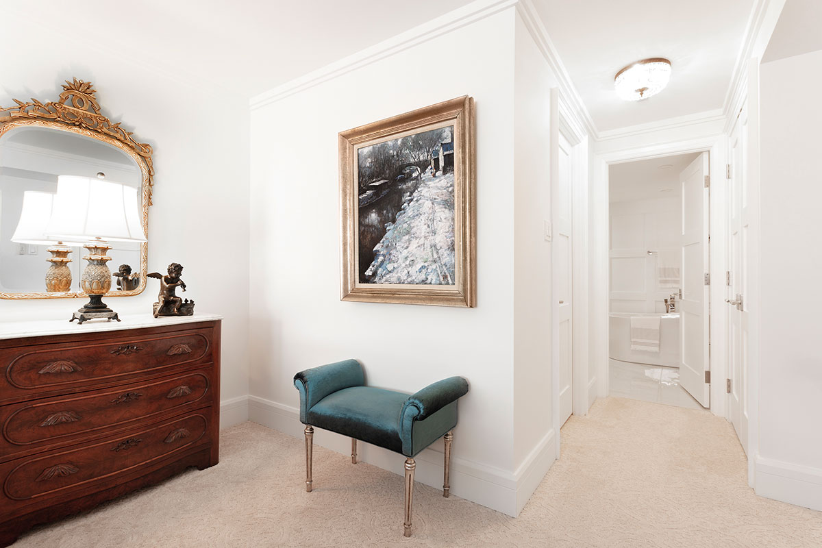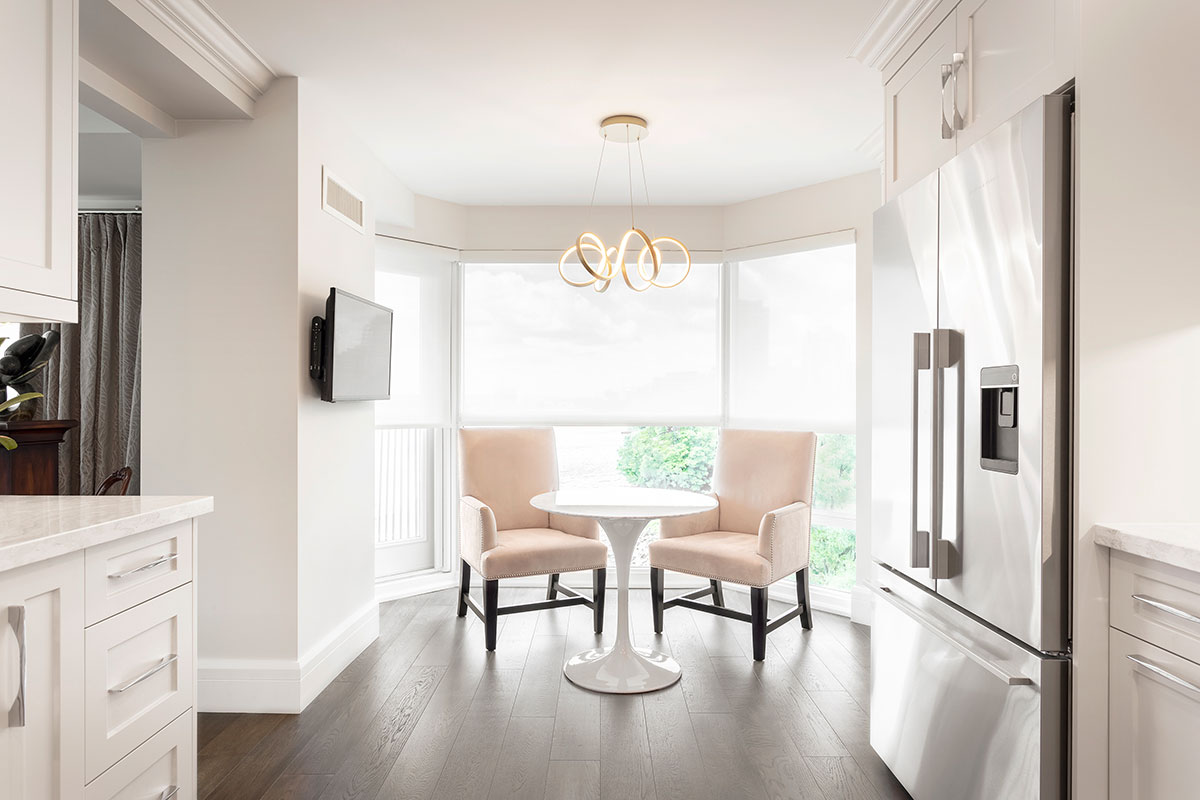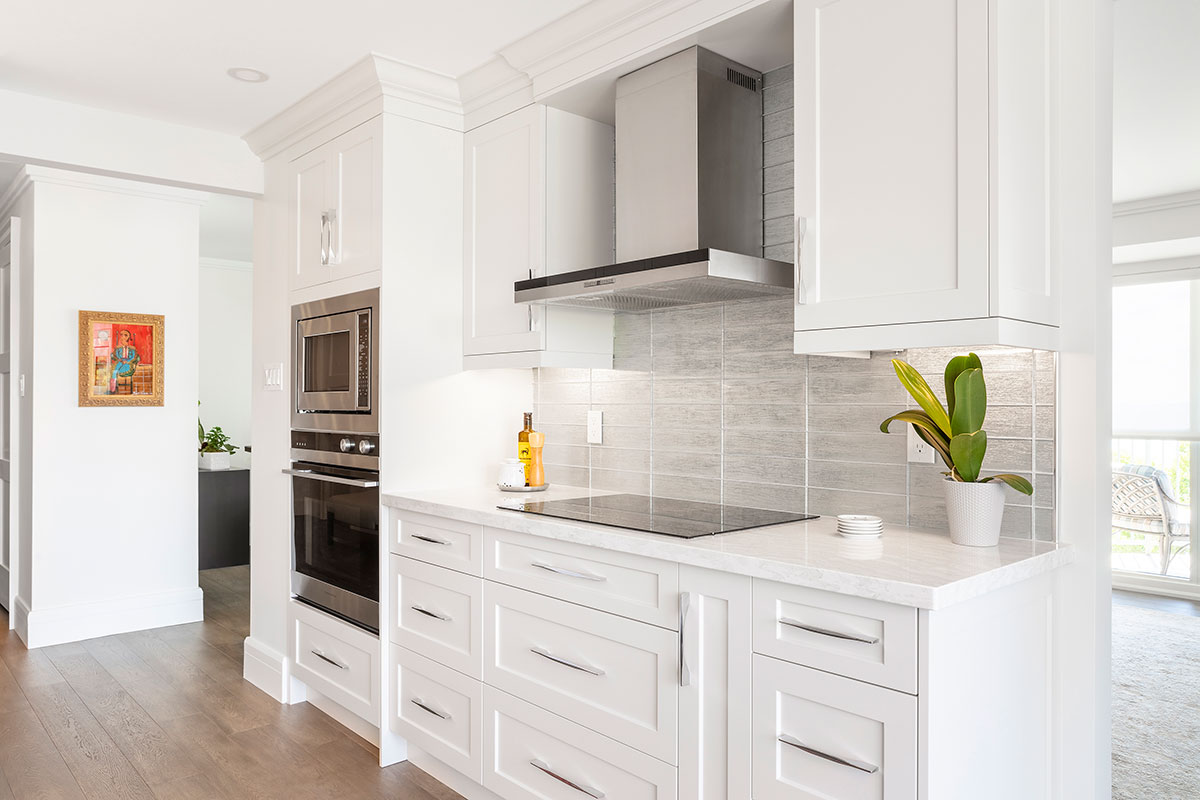 The clients were moving from a home with about 2800 square feet, downsizing to to 1600. A transition they were ready for, if we could utilize the space efficiently, and make it seem larger then it was. White walls, white doors, white ceilings and almost white custom cabinetry suited their desire for a contemporary look. Details include a sculpture niche in the master Ensuite, surrounded by Shaker panelled walls. Practical Luxury Laminate floating floors in the principle areas, ceramic tile in both bathrooms; one dramatic, the other serene.