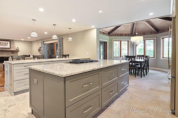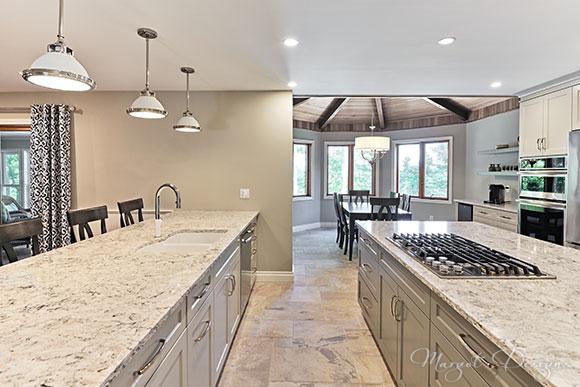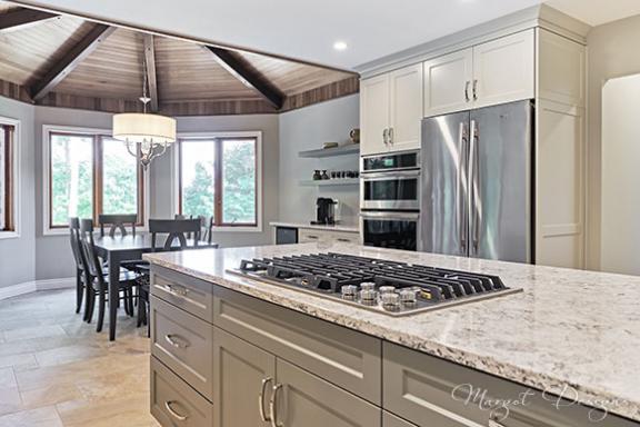 Topping the list of this renovation project was layout. By removing the wall dividing the kitchen from the family room, we made the space more functional with the addition of a peninsula with room for five counter height stools. Getting rid of a tired pantry wall was no problem with the increased kitchen island size and double the storage with banks of drawers both sides. The cabinet door style and colour were next on the list once traffic flow and kitchen cabinet layout were optimized.